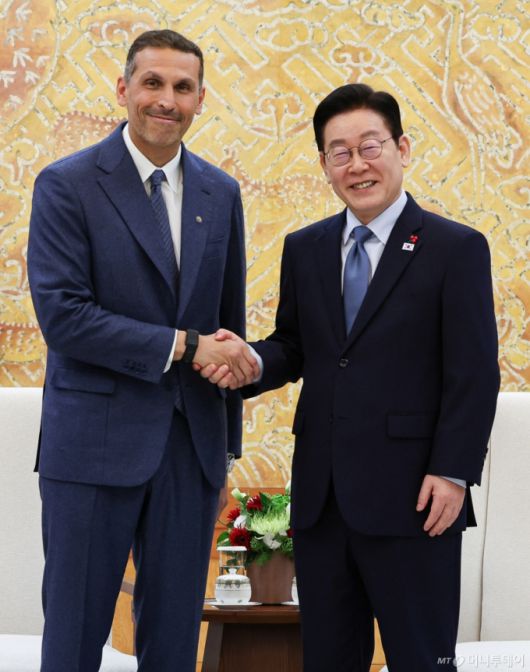 이재명 대통령이 일본에서 귀국한 지 하루 만에 외빈을 맞아 방산·AI(인공지능) 세일즈 외교에 나섰다. UAE(아랍에미리트) 실세로 불리는 칼둔 칼리파 알 무라바크 아부다비 행정청장을 접견하고 "양국 간 어떤 일을 할 수 있을지 세부적인 준비를 많이 했는데 그 문제들도 잘 협의해서 가시적인 성과를 만들어내면 좋겠다"고 강조했다.