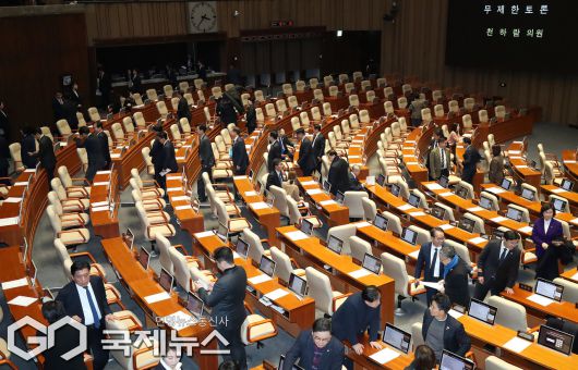 (서울=국제뉴스) 더불어민주당 의원들이 15일 국회에서 열린 본회의에서 천하람 개혁신당 원내대표의 '윤석열ㆍ김건희에 의한 내란ㆍ외환 및 국정농단 행위의 진상규명을 위한 특별검사 임명 등에 관한 법률안'에 대해 무제한 토론(필리버스터)을 시작하자 회의장을 빠져나가고 있다./사진=이용우 기자