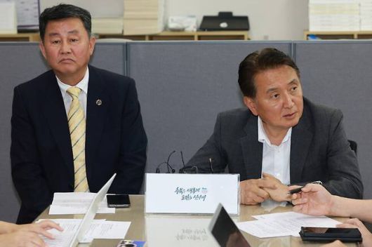 김영환 충북지사(오른쪽)가 지난 2023년 7월 충북도청 기자실에서 김용수(왼쪽) 충북도립대 전 총장 임용 배경 등을 설명하고 있다. 충북도 제공 |