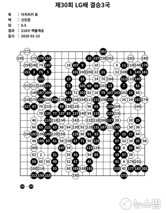 스승의 기운을 받은 신민준은 승부처에서 무서운 집중력을 발휘했다. 중반 한때 이치리키 료의 강력한 공격에 대마가 위험에 처하기도 했으나, 정교한 수읽기로 타개에 성공하며 승기를 잡았다.