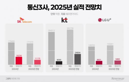 15일 금융정보업체 에프앤가이드에 따르면 통신 3사의 2025년 합산 영업이익 전망치(컨센서스)는 4조5480억원으로 추산된다. 통신3사가 영업이익 4조원대를 기록한 것은 2023년 이후 2년 만이다. 이 기간 SK텔레콤은 1조1170억원, KT는 2조4904억원, LG유플러스는 9460억원을 기록했을 것으로 예상된다.