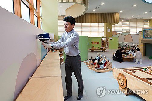 (춘천=연합뉴스) 15일 춘천시립공공도서관내 장난감도서관을 방문한 김진태 강원특별자치도지사가 휴대용 X선 형광 분석기를 활용, 마감재와 목재 등에 포함된 중금속 함유 여부를 현장에서 측정·점검하고 있다. 김 지사는 이날 "어린이는 환경유해인자에 특히 취약한 만큼 사전 점검과 지속적인 관리가 중요하다"고 말했다. 2026.1.15 [강원도 제공.재판매 및 DB 금지]