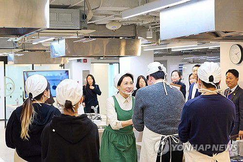 (서울=연합뉴스) 김혜경 여사가 15일 서울 종로구 한식문화공간 이음에서 열린 자립준비청년들을 위한 생일상 차리기 행사에서 참석자들과 인사하고 있다.