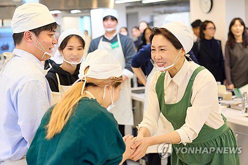 (서울=연합뉴스) 김혜경 여사가 15일 서울 종로구 한식문화공간 이음에서 열린 자립준비청년들을 위한 생일상 차리기 행사에서 참석자들과 인사하고 있다.