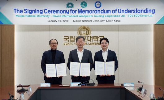 국립목포대학교(총장 송하철)는 15일 본관 2층 총장실에서 대만 해상풍력 전문 교육기관 대만 국제풍력훈련센터(TIWTC) 및 글로벌 인증기관 티유브이슈드 코리아와 '해상풍력 전문인력 양성'을 위한 업무협약(MOU)을 체결했다.