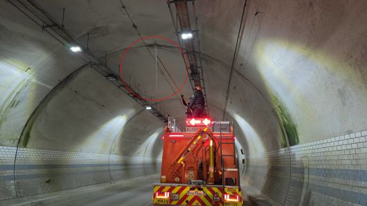 소방 당국이 2025년 12월 27일 충북 청주시 산성동 산성2터널 내부에 생긴 고드름을 제거하고 있다. (사진=충북소방본부) |