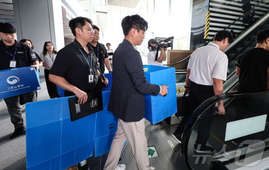 경기남부경찰청과 고용노동부 관계자들이 12일 인천시 연수구 포스코이앤씨 본사 사옥에서 압수품을 담기 위한 박스를 들고 이동하고 있다.2025.8.12/뉴스1 ⓒ News1 김도우 기자 |