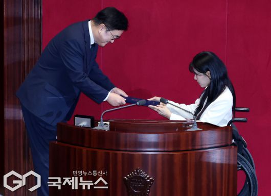 (서울=국제뉴스) 국민의힘 비례대표를 승계받은 이소희 의원이 15일 오후 서울 여의도 국회에서 열린 제431회국회(임시회) 제1차 본회의에서 우원식 국회의장에게 선서문을 제출하고 있다./사진=이용우 기자