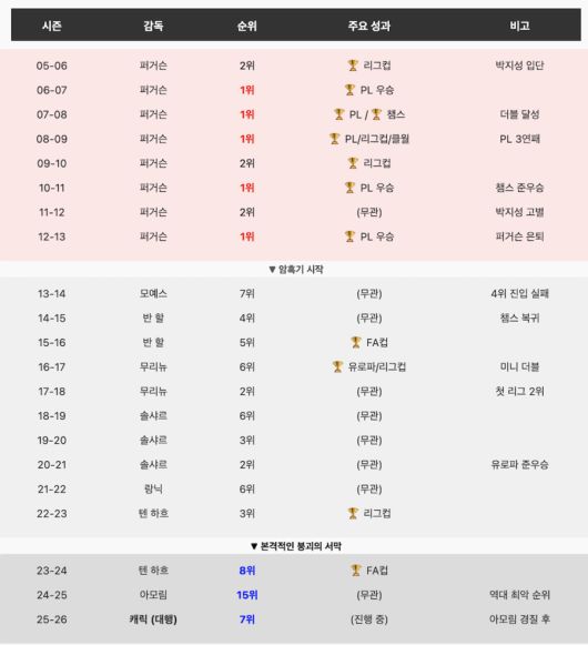 박지성이 몸 담았던 2005년부터 2012년까지 무관 시즌은 2011-12시즌이 유일했다. 2005-26시즌과 2009-10시즌에 리그 준우승, 당시에는 실패한 시즌이라고 불렸을 때도 리그컵 정도는 꼭 챙겨오는 팀이었다. 퍼거슨 감독 은퇴 시즌에도 프리미어리그 통산 20번째 리그 우승으로 존재감을 뽐냈다.