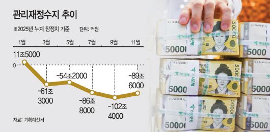 15일 기획예산처가 발표한 '월간 재정동향 1월호'에 따르면 작년 11월 말 기준 관리재정수지는 89조6000억원 적자로 집계됐다. 이는 같은 기간 기준으로 2020년(98조3000억원), 2022년(98조)에 이어 역대 세 번째로 많은 수준이다. 전년 같은 기간과 비교하면 적자 폭은 8조3000억원 확대됐다. 관리재정수지는 통합재정수지에서 국민연금 등 4대 보장성 기금을 제외해 정부의 실질적인 재정 여건을 보여준다.