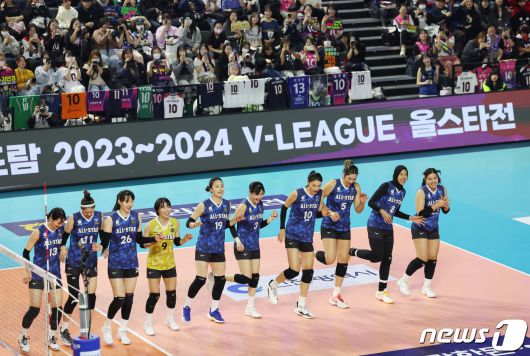 2024 프로배구 올스타전에서 팬들과 함께 즐거운 시간을 보내는 선수들. 2024.1.27/뉴스1 ⓒ News1 김민지 기자 |