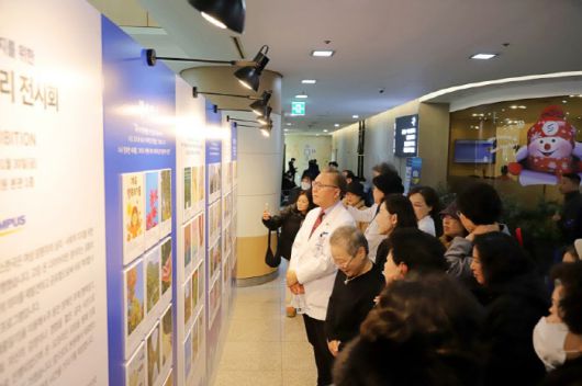 문종호 순천향대 부천병원장과 암 경험자 등 관계자들이 '고잉 온 다이어리' 전시회를 함께 관람하고 있다. |