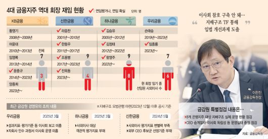 이 대통령이 지적한 것처럼 금감원은 금융지주 회장이 장기간 연임하는 것에 대해 문제가 있는지 들여다볼 것으로 판단된다. 역대 4대 금융지주 CEO 중 4연임 한 CEO는 라응찬 전 신한금융 회장과 김정태 전 하나금융 회장 2명이고, 3연임한 CEO도 윤종규 전 KB금융 회장과 김승유 전 하나금융 회장 2명이다. 현 CEO 중에선 함영주 하나금융 회장과 진옥동 신한금융 회장, 임종룡 우리금융 회장이 연임에 성공했다. 다만 진 회장과 임 회장은 3월 주총에서 최종적으로 연임이 확정된다.