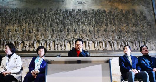 장동혁 국민의힘 대표(가운데)가 15일 국회 로텐더홀에서 여당을 향해 통일교의 정치권 로비 의혹, 공천헌금 의혹 등 이른바 '쌍특검법' 수용을 촉구하며 단식농성을 하고 있다. /이병화 기자 |