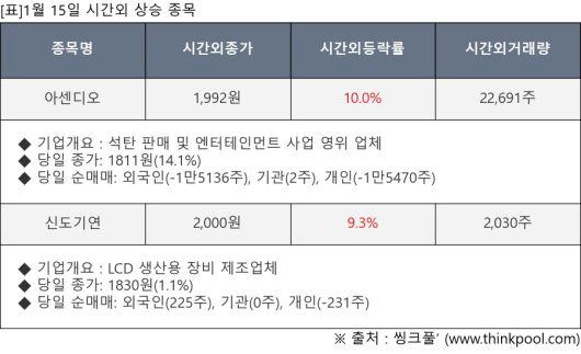 [서울=뉴스핌] 로보뉴스 = 1월 15일, 인공지능 투자비서 ‘AI라씨로’가 아센디오(012170), 신도기연(290520) 등 시간외 단일가 매매 상승률 상위 종목들에 대한 최근 동향을 분석했다.