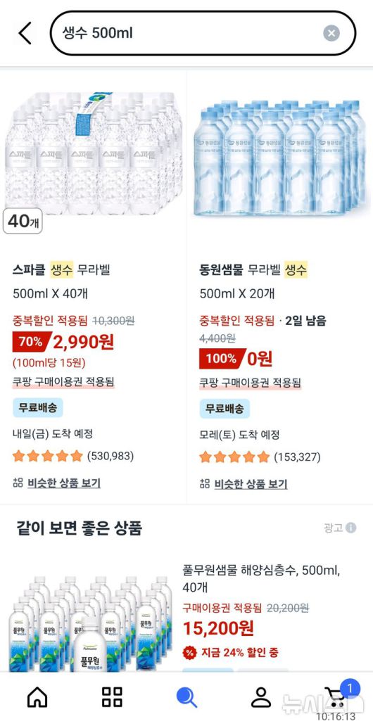 [서울=뉴시스] 쿠팡이 개인정보 유출 사고에 대한 보상으로 1인당 5만원 규모의 구매 이용권을 15일 오전 10시부터 순차 지급하고 있다. 사진은 쿠폰을 지급받은 상태에서 '생수 500㎖'를 검색했을 때 표시되는 애플리케이션(앱) 화면. (사진=앱 화면 갈무리) 2026.01.15. photo@newsis.com |