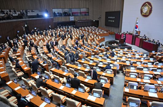 천하람 개혁신당 의원이 15일 국회에서 열린 본회의에서 윤석열·김건희에 의한 내란·외환 및 국정농단 행위의 진상규명을 위한 특별검사 임명 등에 관한 법률안에 대한 무제한토론(필리버스터)을 하는 가운데 더불어민주당 의원들이 회의장을 나서고 있다. /송의주 기자 songuijoo@ |