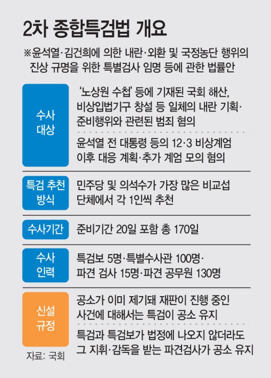 15일 정치권에 따르면 '2차 종합 특검법'이 1월 임시국회 첫 본회의에 상정됐다. 이는 작년 말 종료된 3대 특검(내란·김건희·채상병 특검)에서 규명하지 못한 의혹들을 파헤치기 위한 법안이다. 윤석열 전 대통령에 대한 내란·외환, 노상원 수첩 의혹, 임성근 전 사단장 구명 로비 등이 대표적이다. 특검은 총 160명에 달하는 인력으로 구성되며 수사도 최장 170일까지 가능하다.