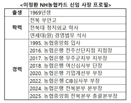 이정환 사장은 여신부문과 기업금융에서 전문성을 쌓았을 뿐 아니라 농협은행 전북본부 본부장, 농협중앙회 전북본부 총괄본부장을 지내 지역농협 네트워크가 풍부하다. 농협카드가 농축협 채널에서 고객 유치가 많이 이뤄진 만큼, 지역 농협 접점이 많은 이정환 부행장에 농협카드는 맡긴 것으로 풀이된다.
