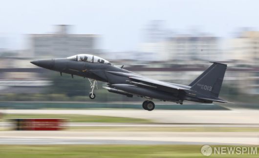 [대구=뉴스핌] 이한결 기자 = 27일 오전 대구 공군기지(K-2기지)에서 열린 '제71주년 국군의 날 미디어데이'에서 F-15K 전투기가 이륙하고 있다. 2019.09.27 alwaysame@newspim.com |