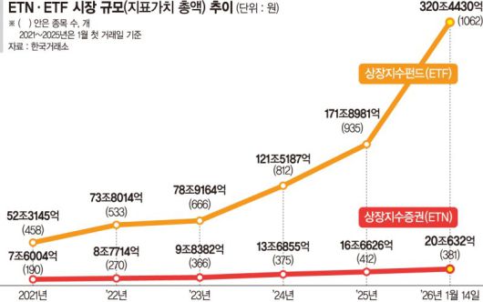 15일 한국거래소에 따르면 전날 기준 ETN 지표가치 총액은 20조632억원으로 집계됐다. 지난해 1월 초(16조6626억원) 대비 1년간 20.41% 늘어난 수치다. 다만, 증시 호황에 힘입어 ETF 시장이 빠르게 몸집을 불려 나가는 것과 달리 ETN은 상대적으로 부진한 흐름을 보이고 있다. ETF 순자산 총액은 지난해 초 171조8981억원에서 지난 14일 320조4330억원으로 1년간 86.41% 성장했다. 5년 전인 2021년 1월 초와 비교해도 ETF 규모는 512.53%나 늘었지만, ETN은 163.98% 성장하는 데 그쳤다.