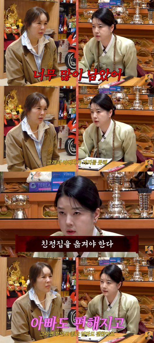 상담 말미에는 무속인이 장영란의 친정집과 관련된 조언도 건넸다. 그는 "엄마 집에 아직 아버지 물건이 많아서 정리하지 못한다. 친정집을 옮기는 것을 추천한다"고 말했다.