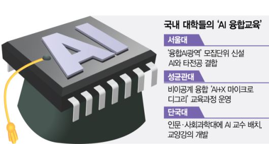 다른 대학에서도 학문 간 경계를 허무는 AI 융합 교육이 활발히 이뤄지는 분위기다. 단국대는 지난해부터 17개 단과대에 AI 전공 교수를 배치하고 필수 AI 강의를 도입했다. △경영·경제 분야 AI 활용 입문 △AI를 활용한 스포츠 코칭 등 각 단과대 특성에 맞는 교과목을 개발해 운영 중이다. 성균관대 역시 2022년부터 문과대·사범대 등 비이공계 단과대가 참여하는 ‘AI+X 마이크로디그리’를 시행하고 있다. AI경제학·AI예술과 같은 융합 과정을 개설해 일정 학점 이상을 이수한 학생에게는 인증서를 발급하는 식이다.