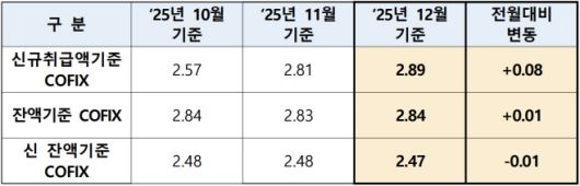 15일 은행연합회에 따르면 12월 신규취급액 기준 코픽스는 2.89%로, 전월(2.81%)보다 0.08%포인트 상승했다.