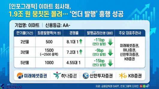 수요예측 결과, 이마트는 당초 모집 금액인 3000억 원의 6배를 상회하는 총 1조 9400억 원의 참여 신청을 받았다. 구체적으로는 500억 원을 모집한 2년물에 4050억 원이 몰려 8.1대 1의 경쟁률을 기록했으며, 1500억 원을 모집한 3년물에는 가장 많은 1조 800억 원(7.2대 1)이 유입됐다. 1000억 원 규모의 5년물 역시 4550억 원(4.55대 1)의 신청을 받으며 전 만기 구간에서 고른 흥행을 보였다.