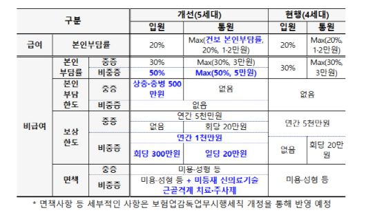 5세대 실손보험의 핵심은 현재 실손보험을 '보편적·중증 의료비' 중심의 적정 보장 상품으로 전환하는 것이다. 우선 급여 통원 의료비의 본인 부담률을 국민건강보험과 연동해 건강보험 본인부담제도의 정책효과를 제고한다. 급여 입원은 증증질환인 경우가 많고, 남용 우려가 크지 않아 4세대 실손보험처럼 20%의 본인부담률을 적용한다.