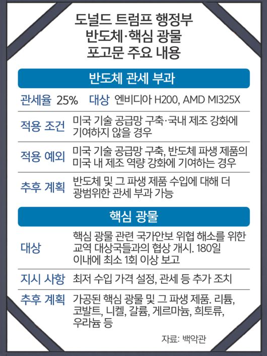 14일(현지시간) 트럼프 대통령이 서명한 AI칩 관련 포고문은 실질적으로 대만 TSMC에서 생산돼 미국을 거쳐 중국으로 향하는 엔비디아의 H200, AMD의 MI325X 칩을 겨냥한 것이다.