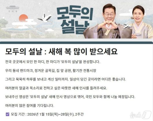 이 대통령은 "2026년 설날이 한 달 앞으로 다가왔다"며 "진심이 담긴 목소리, 서로의 안녕을 기원하는 따듯한 눈빛과 환한 표정이 모여 '모두의 설날'을 완성할 것"이라고 했다.