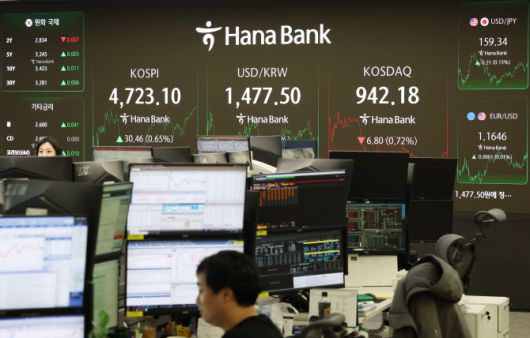 코스피가 14일 사상 처음으로 4,700선을 돌파해 장을 마친 14일 서울 중구 하나은행 딜링룸 현황판에 코스피지수가 표시돼 있다.(사진=연합뉴스) |