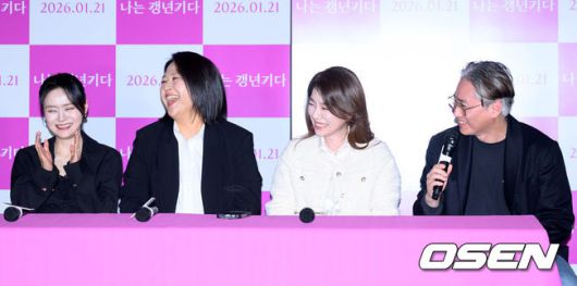 [OSEN=이대선 기자] 15일 오후 롯데시네마 건대입구점에서 영화 '나는 갱년기다' 언론시사회가 열렸다. '나는 갱년기다'는 영원한 소녀들의 두 번째 사춘기, 갱년기를 맞은 세 친구들이 몸과 감정의 변화를 맞이하는 과정을 그린 성장 드라마다. 배우 성일의 말에 김영선, 전현숙, 유담연이 웃고 있다. 2026.01.15 /sunday@osen.co.kr
