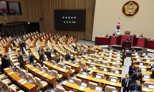 15일 국회에서 열린 2026년 1월 임시국회 1차 본회의에서 천하람 개혁신당 원내대표가 2차 종합특검 법안에 대해 무제한 토론을 하는 가운데 더불어민주당 의원들이 회의장을 빠져나가고 있다. 연합뉴스 |