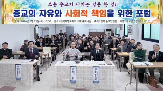 전북종교인연합(상임공동의장 허종현·이상재·혜광스님)은 15일 전주시 덕진구 안덕원로 전북UPF 세미나실에서 ‘종교의 자유와 사회적 책임을 위한 포럼’을 개최했다. 한국종교협의회와 KCLC 후원으로 이뤄진 이날 포럼에는 기독교·불교·유교·원불교·천도교·가정연합·신종교 등 다양한 종단 지도자와 시민, 학계 인사 등 50여명이 참석했다.