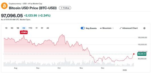 한국시간 기준 비트코인(BTC) 가격은 9만6000달러 안팎에서 거래되며, 연초 이후 약 10% 상승했다. 이는 11월 중순 이후 처음으로 10만 달러 재돌파 가능성을 다시 열어두는 흐름이다.