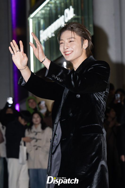 아이엔은 블랙 벨벳 수트로 멋을 냈다. 잘생긴 비주얼이 시선을 사로잡았다.