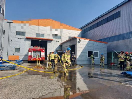 경남 창원시 의창구 팔용동의 한 공작기계 제작업체 화재 현장에서 소방대원들이 진화작업을 벌이고 있다. 창원소방본부 제공 |