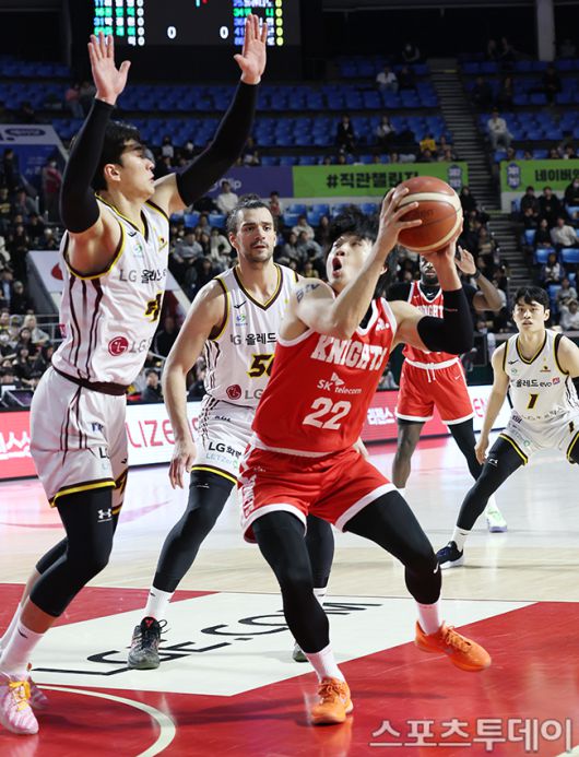 [스포츠투데이 권광일 기자] 2025-2026 LG전자 프로농구 서울SK와 창원LG의 경기가 15일 서울학생체육관에서 열렸다. 서울SK 오재현이 골밑에서 훼이크를 하고 있다. 2026.01.15. [스포츠투데이 권광일 기자 sports@stoo.com]