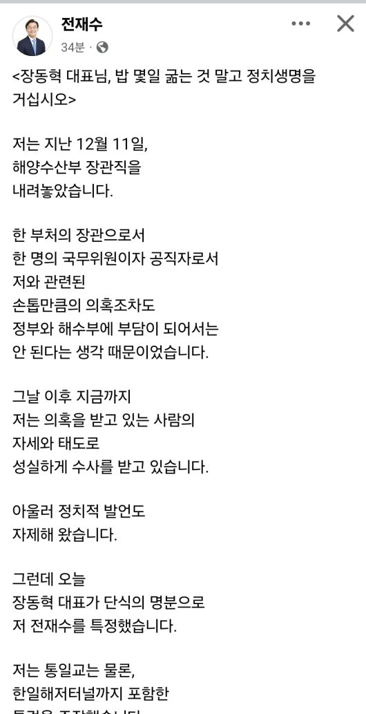 전 전 장관은 "지난해 12월 11일 장관직을 내려놓은 이후 지금까지 성실히 수사를 받고 있고, 정치적 발언도 자제해 왔다”며 “그런데도 단식 명분으로 저를 특정한 것은 국민의힘 내부 위기를 모면하려는 정치기술에 불과하다"고 날을 세웠다. 그러면서 "통일교 의혹은 물론 한일해저터널 의혹까지 포함한 특검을 모두 받겠다"고 밝혔다.