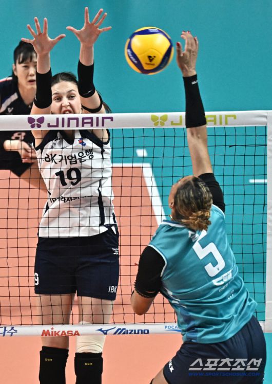 15일 서울 장충체육관에서 열린 배구 V리그 여자부 GS칼텍스와 IBK기업은행의 경기. GS칼텍스 실바가 IBK기업은행 빅토리아의 블로킹을 앞에 두고 스파이크를 날리고 있다. 장충동=송정헌 기자songs@sportschosun.com/2026.01.15/