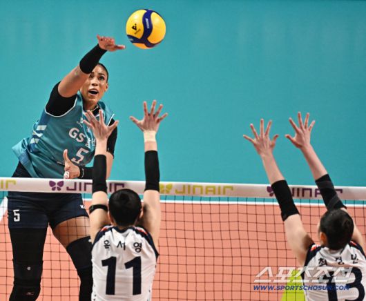 15일 서울 장충체육관에서 열린 배구 V리그 여자부 GS칼텍스와 IBK기업은행의 경기. GS칼텍스 실바가 IBK기업은행 블로킹을 앞에 두고 스파이크를 날리고 있다. 장충동=송정헌 기자songs@sportschosun.com/2026.01.15/ |