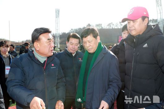 [울산=뉴시스] 울산웨일즈 프로야구단 선수 선발을 위한 공개선발시험(트라이아웃) 첫 날인 13일 김두겸(왼쪽) 시장이 울산 문수야구장을 방문해 허구연(가운데) KBO총재 등과 선수 선발 과정을 참관하고 있다.(사진=울산시 제공). 2026.01.13. photo@newsis.com. *재판매 및 DB 금지 |