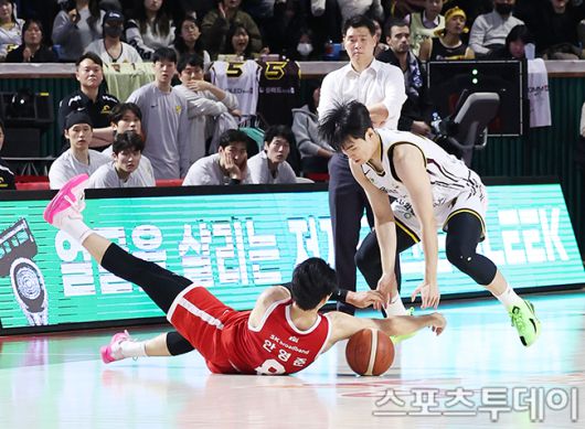 [스포츠투데이 권광일 기자] 2025-2026 LG전자 프로농구 서울SK와 창원LG의 경기가 15일 서울학생체육관에서 열렸다. 서울SK 안영준, 창원LG 최형찬이 볼다툼을 하고 있다. 2026.01.15. [스포츠투데이 권광일 기자 sports@stoo.com]