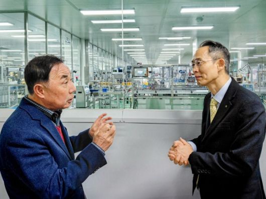 황기연 한국수출입은행장(오른쪽)이 15일 충북 음성 코스메카코리아 본사를 방문해 지재성 부회장과 대화를 나누고 있다. 사진ㅣ한국수출입은행 |