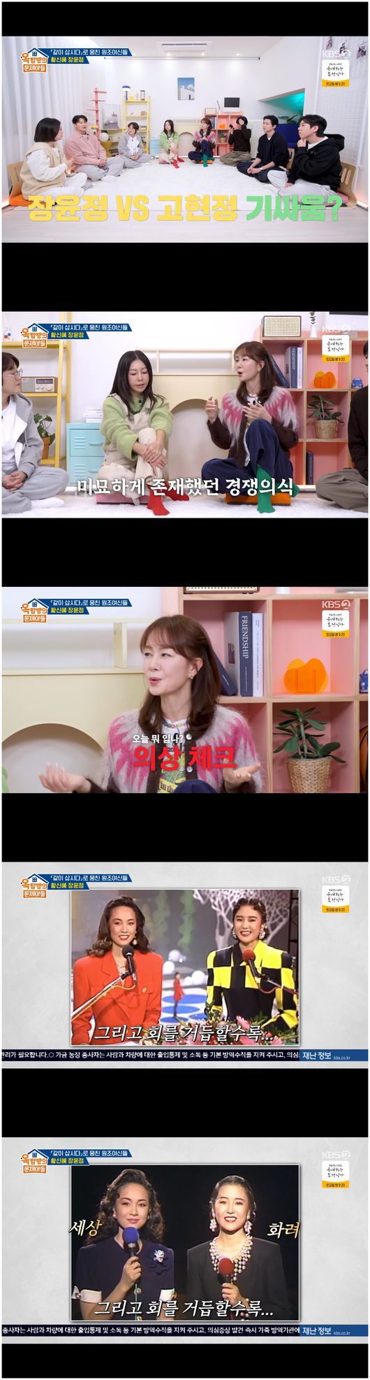 첫 생방 후 고현정과 끌어안고 울 정도로 안도감을 느꼈던 장윤정. 이후 기싸움도 있었다고 솔직히 말했다. 김숙은 “그때 기싸움 같은 건 없었냐”라며 물었다. 장윤정은 “당연히 경쟁 의식은 있었다. 그런데 그게 나쁜 건 아니다. 오히려 더 발전하지 않냐. 둘 다 미스코리아니까 의상을 신경 썼다”라고 말했다.