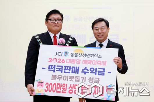 (울산=국제뉴스) 주영곤 기자 = 동울산청년회의소(회장 전종현)는 15일 울산 동구청 2층 대강당에서 가진 신년인사회에서 지난해 '대왕암해맞이축제 수익금300만원'을 어려운 이웃을 위해 써달라며 김종훈 동구청장에게 전달하고 있다.