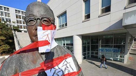 | 성신여대 설립자 이숙종 박사 동상에 남학생 모집 반대 문구 종이가 붙은 모습 / 사진=연합뉴스 |