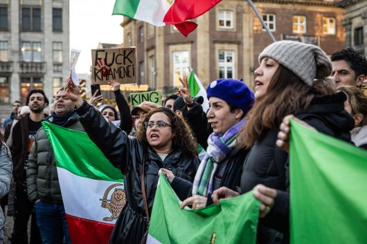 14일 네덜란드 암스테르담에서 열린 이란 반정부 시위에 모인 사람들이 이란 왕정시기 국기를 들고 하메네이 이란 최고지도자의 퇴진 구호를 외치고 있다. /AFP 연합뉴스 |